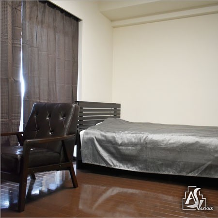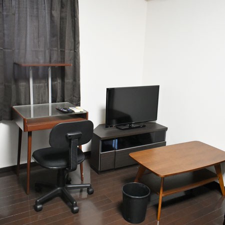 ・8帖の洋室には、セミダブルベッド、ソファ、デスク&チェア、32型液晶テレビを設置しました。