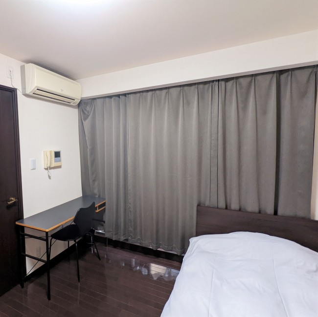 イス、カーテン付き、シーツ類、テレビ台、デスク、ベッド、寝具一式
