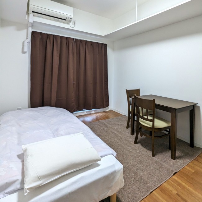 イス、カーテン付き、シーツ類、テーブル、テレビ台、ベッド、寝具一式