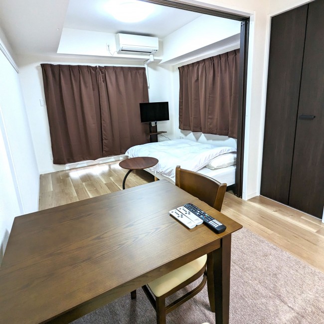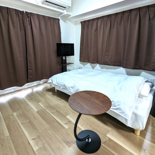 イス、カーテン付き、シーツ類、テーブル、テレビ台、ベッド、寝具一式