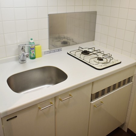 まな板、ガスコンロ、キッチン洗剤、スポンジ、フライパン、食器類、片手鍋、包丁