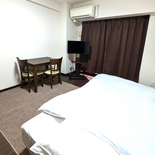 イス、カーテン付き、シーツ類、テーブル、テレビ台、ベッド、寝具一式