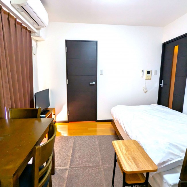 イス、カーテン付き、シーツ類、テーブル、テレビ台、ベッド、寝具一式