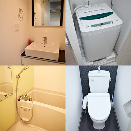 トイレットペーパー、シャワー、トイレ洗剤、トイレ用ブラシ、バスマット、バス洗剤、脱衣所、風呂用スポンジ、浴室乾燥機