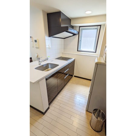 IHクッキングヒーター、まな板、キッチン洗剤、スポンジ、フライパン、食器類、片手鍋、包丁