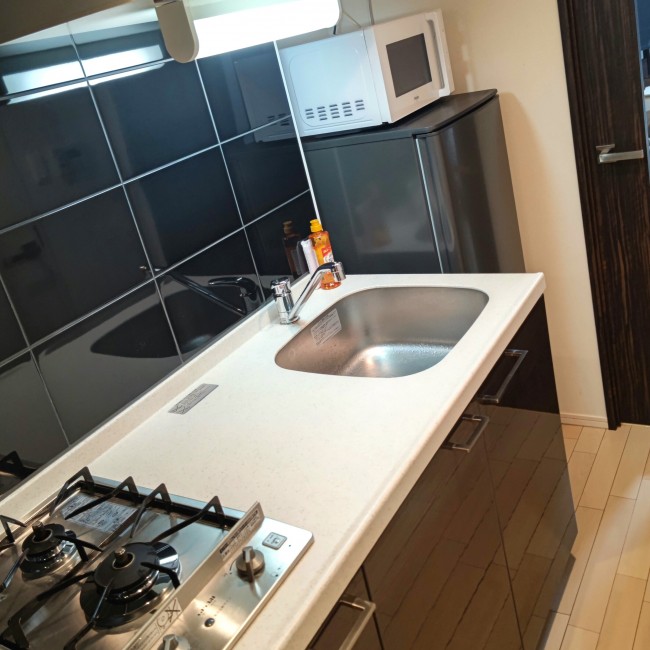 まな板、ガスコンロ、キッチン洗剤、スポンジ、フライパン、食器類、片手鍋、包丁