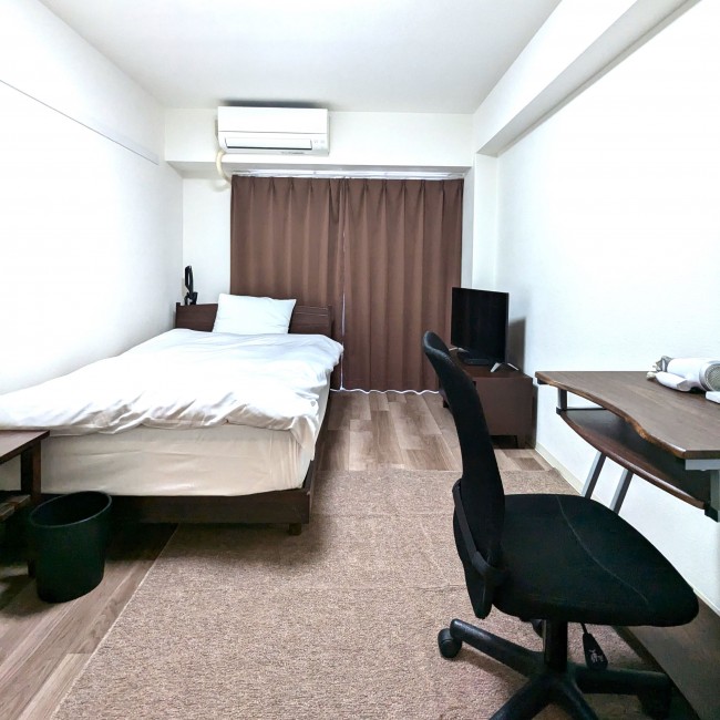イス、カーテン付き、シーツ類、テレビ台、デスク、ベッド、寝具一式