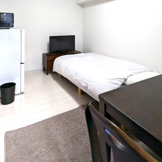 イス、カーテン付き、シーツ類、テーブル、テレビ台、ベッド、寝具一式
