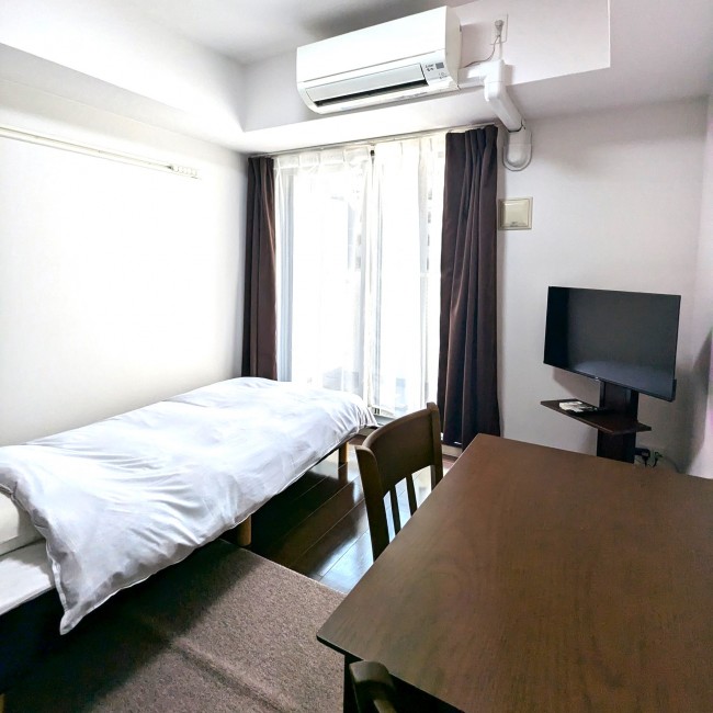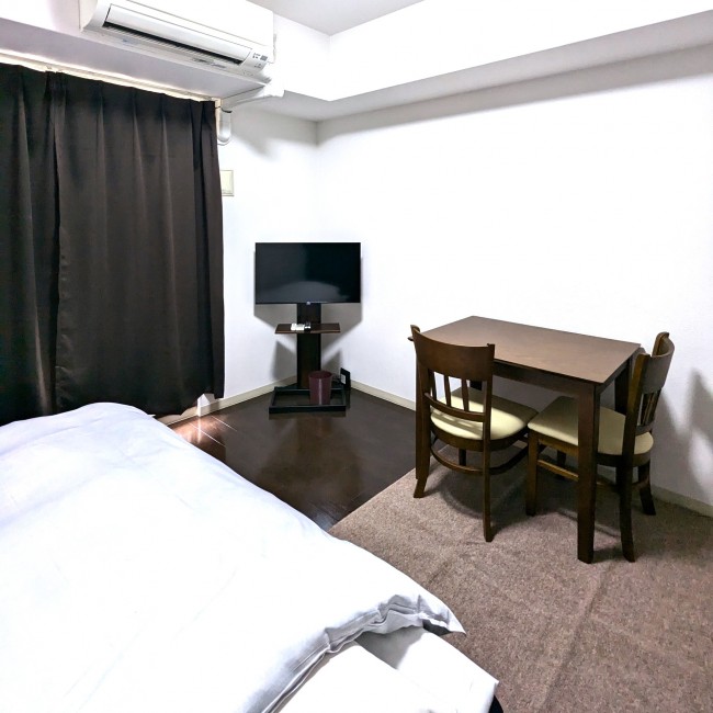 イス、カーテン付き、シーツ類、テーブル、テレビ台、ベッド、寝具一式