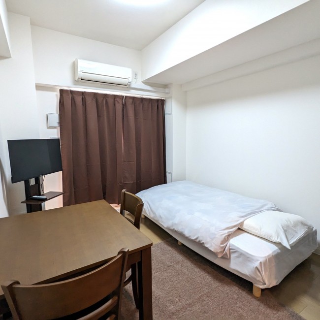イス、カーテン付き、シーツ類、テーブル、テレビ台、ベッド、寝具一式