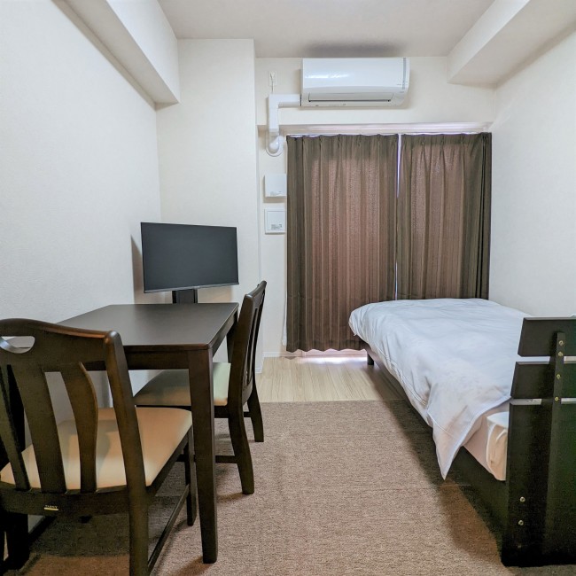 イス、カーテン付き、シーツ類、テーブル、テレビ台、ベッド、寝具一式