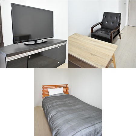 カーテン付き、シーツ類、ソファー、テーブル、テレビ台、ベッド、寝具一式