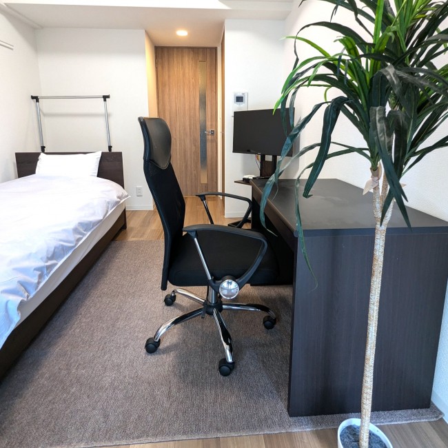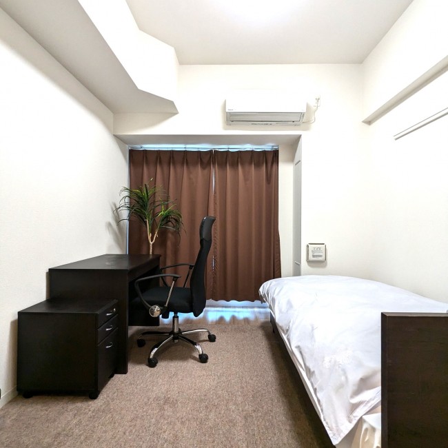 イス、カーテン付き、シーツ類、テレビ台、デスク、ベッド、寝具一式