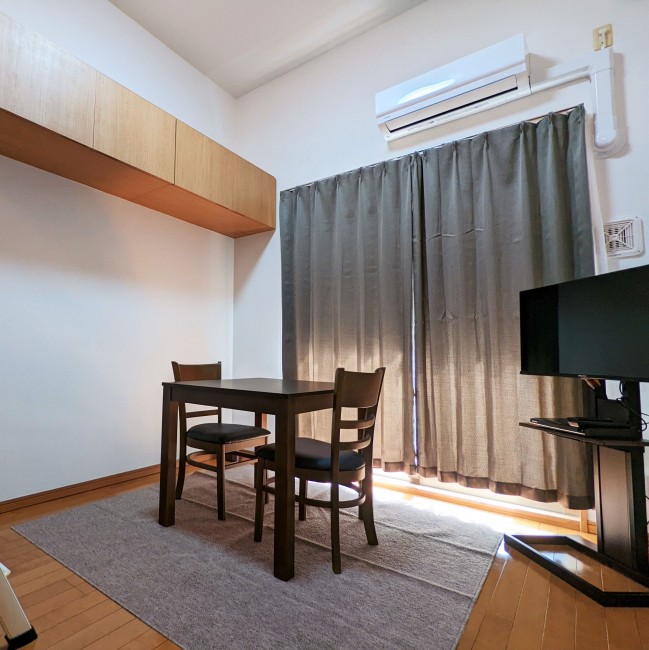 イス、カーテン付き、シーツ類、テーブル、テレビ台、寝具一式