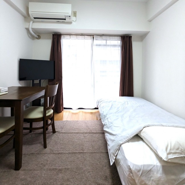 イス、カーテン付き、シーツ類、テーブル、テレビ台、ベッド、寝具一式