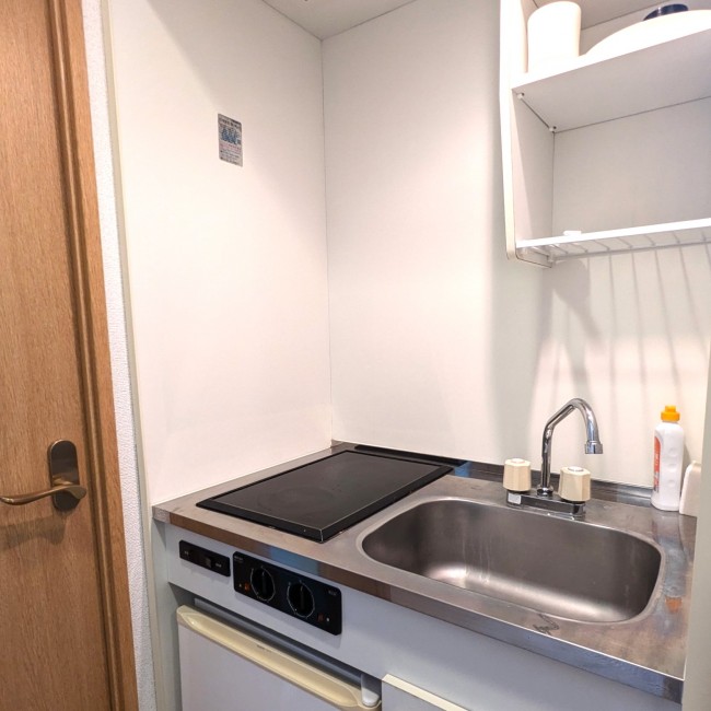 IHクッキングヒーター、まな板、キッチン洗剤、スポンジ、フライパン、食器類、片手鍋、包丁