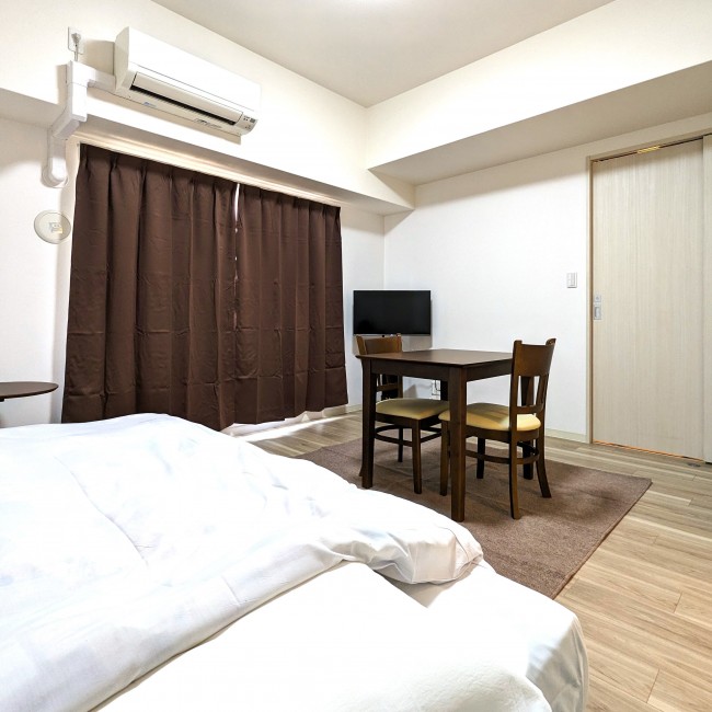 イス、カーテン付き、シーツ類、テーブル、テレビ台、ベッド、寝具一式