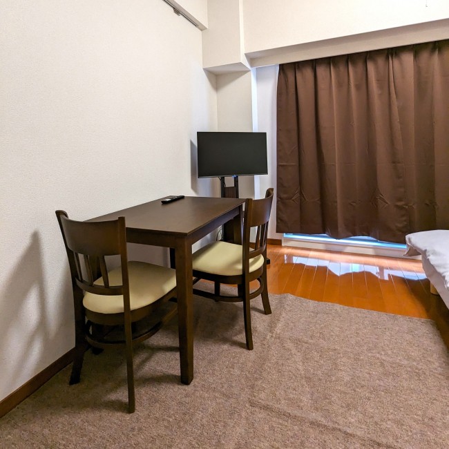 イス、カーテン付き、シーツ類、テーブル、テレビ台、ベッド、寝具一式