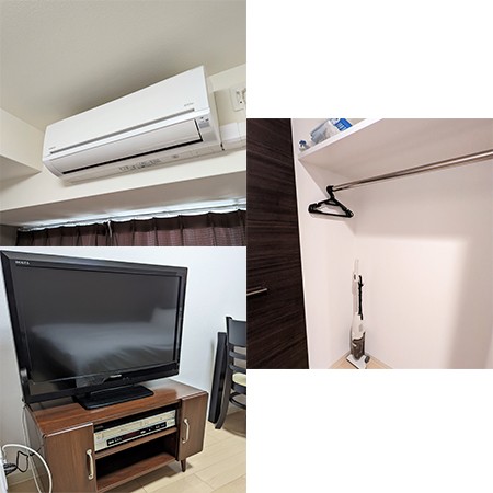 クローゼット、バス・トイレセパレート、フローリング、洗浄機能付き便座、洗濯機置き場(室内)、冷暖房完備、インターネット対応(ポケットWi-Fi)