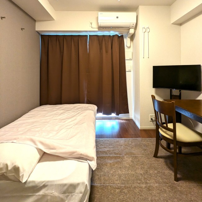 イス、カーテン付き、シーツ類、テーブル、テレビ台、ベッド、寝具一式