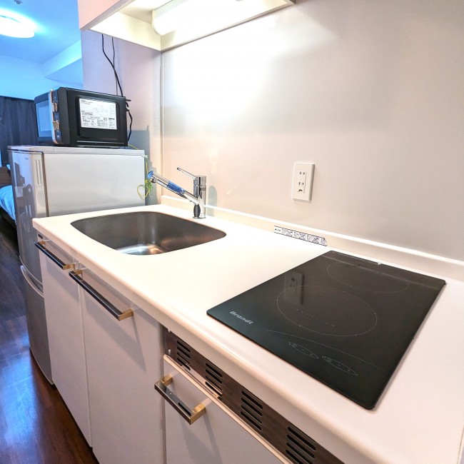 IHクッキングヒーター、まな板、キッチン洗剤、スポンジ、フライパン、食器類、片手鍋、包丁