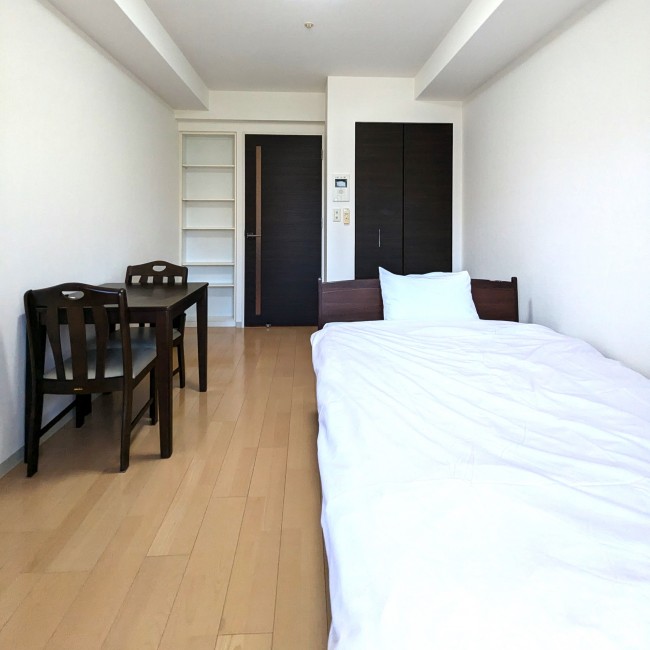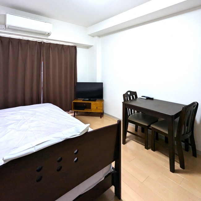 ・7.2帖のお部屋にセミダブルベッドとダイニングセットを設置しています。
