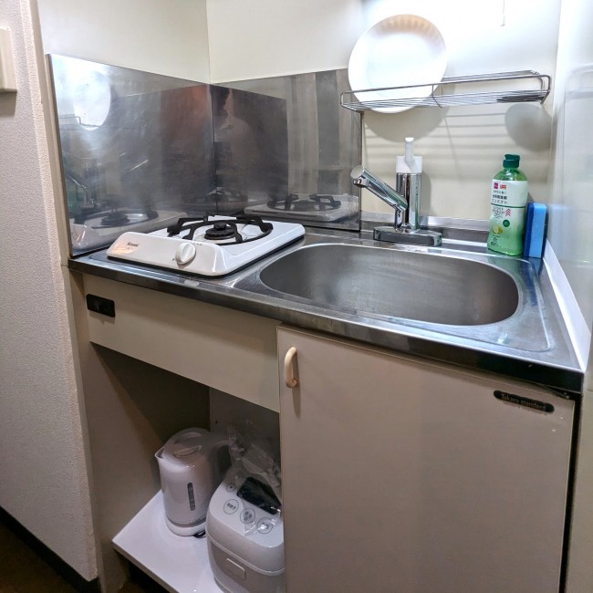 まな板、ガスコンロ、キッチン洗剤、スポンジ、フライパン、食器類、片手鍋、包丁