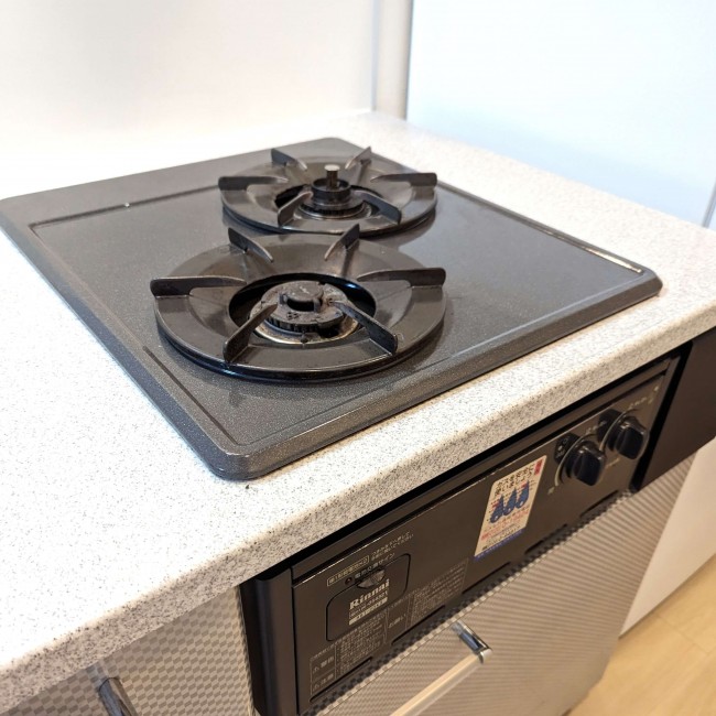 ・宅配ボックス、カウンター付きキッチンの2口ガスコンロ、浴室乾燥、温水洗浄便座、トランクルーム、専用ポーチと設備充実。