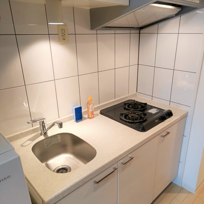 まな板、ガスコンロ、キッチン洗剤、スポンジ、フライパン、食器類、片手鍋、包丁