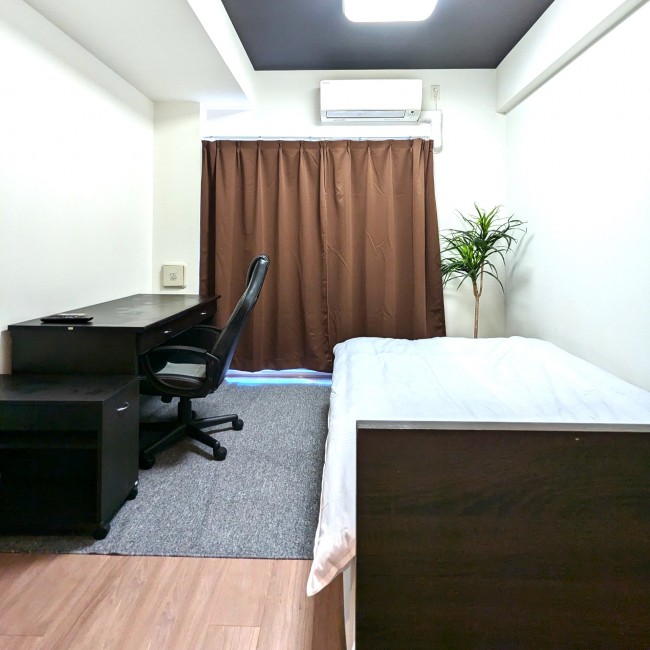 イス、カーテン付き、シーツ類、テレビ台、デスク、ベッド、寝具一式