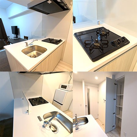 まな板、ガスコンロ、キッチン洗剤、スポンジ、フライパン、食器類、片手鍋、包丁