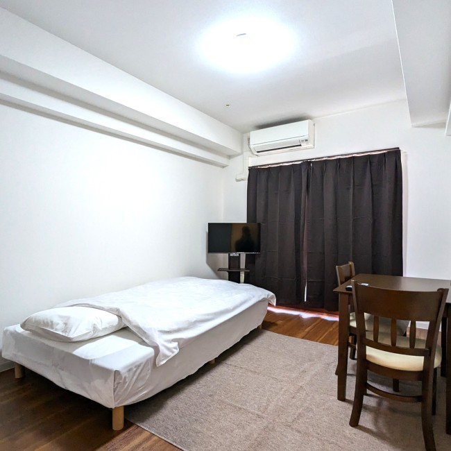イス、カーテン付き、シーツ類、テーブル、テレビ台、ベッド、寝具一式