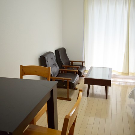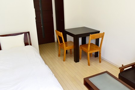 ・少し広めの8.2帖のお部屋にダブルベッドにダイニングセット、ソファ2脚をご用意しております。