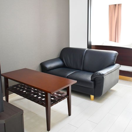 ・1DKののお部屋にダブルベッド、ダイニングセット、ダブルソファを設置しています。